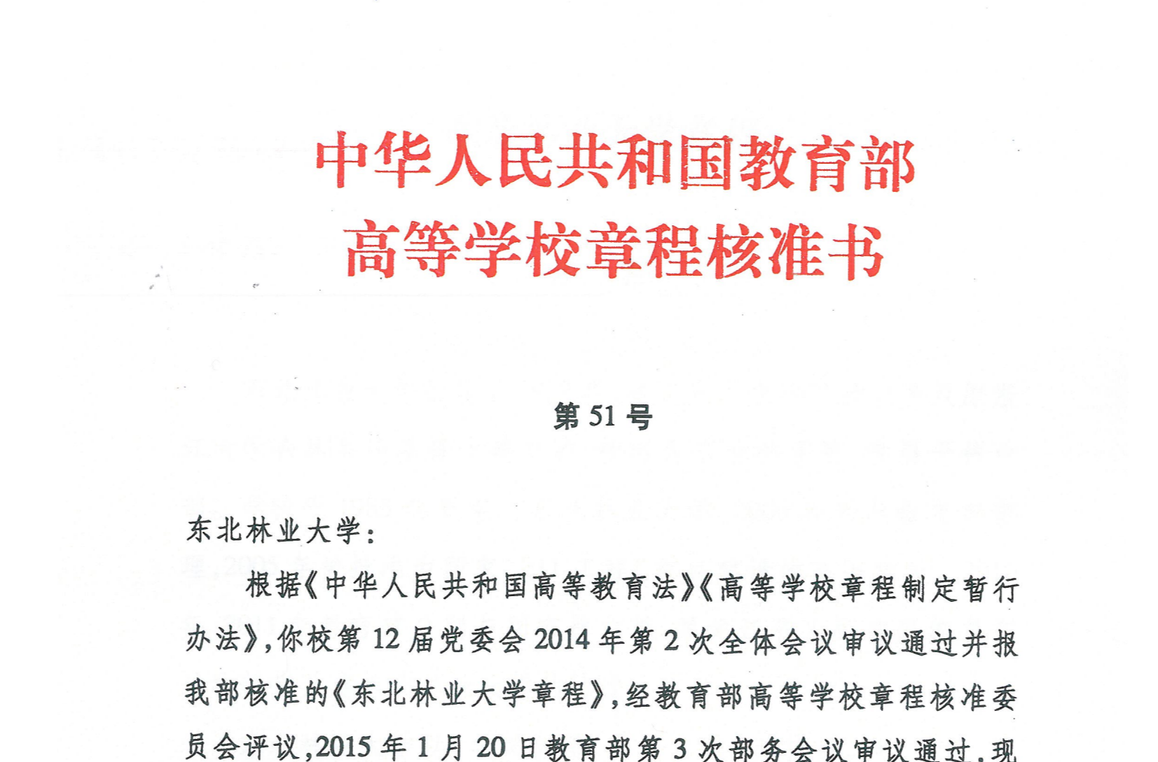 2015年3月11日,教育部发布高等学校章程第51号核准书,正式对《东北林业大学章程》予以核准通过,标志着我校现代大学制度建设取得重大进展。核准书...