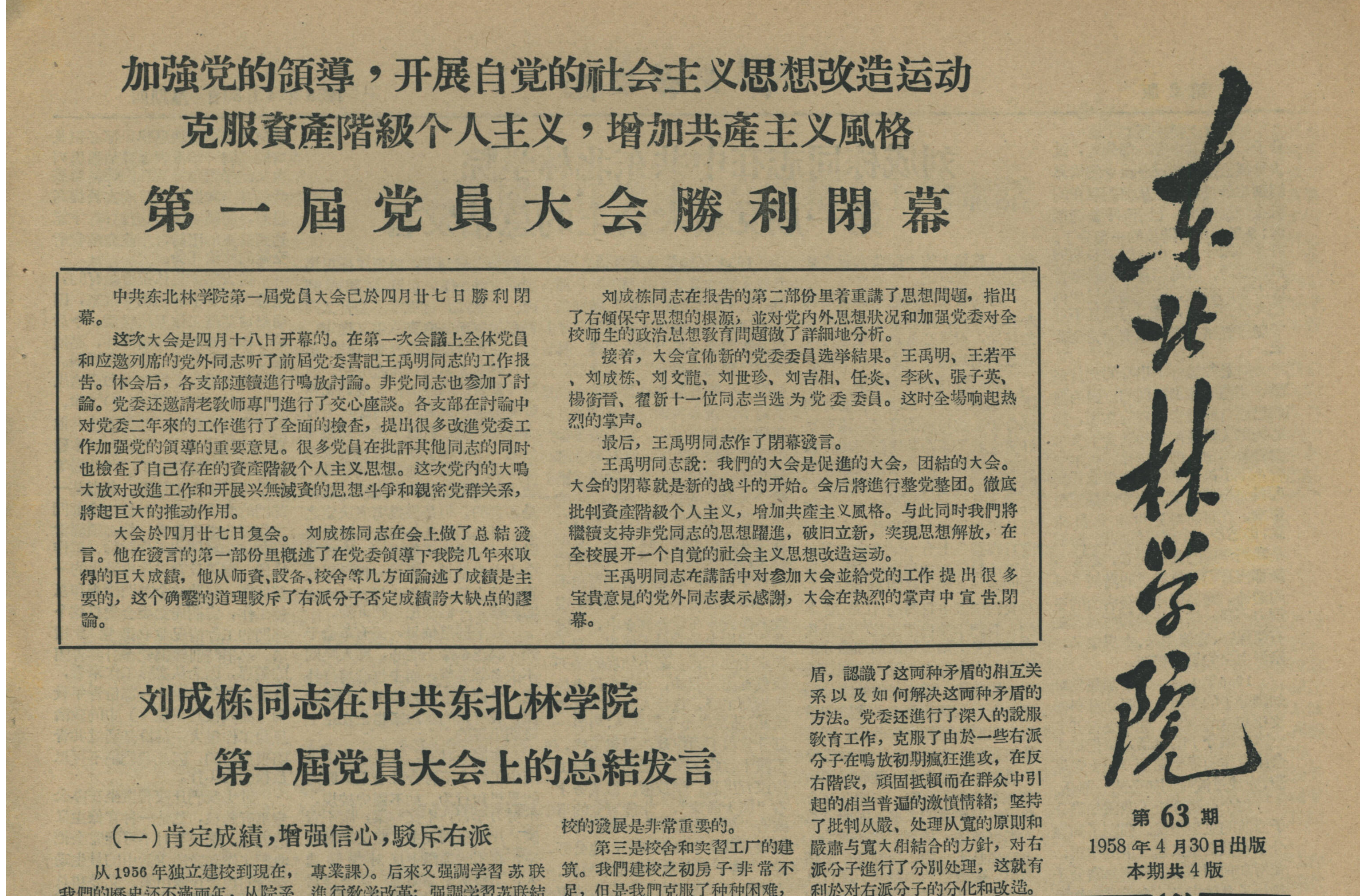 1958年4月27日,东北林学院第一届党员大会胜利闭幕。这次大会是4月18日开幕的。在第一次会议上全体党员和应邀列席的党外同志听了前届党委书记王禹...