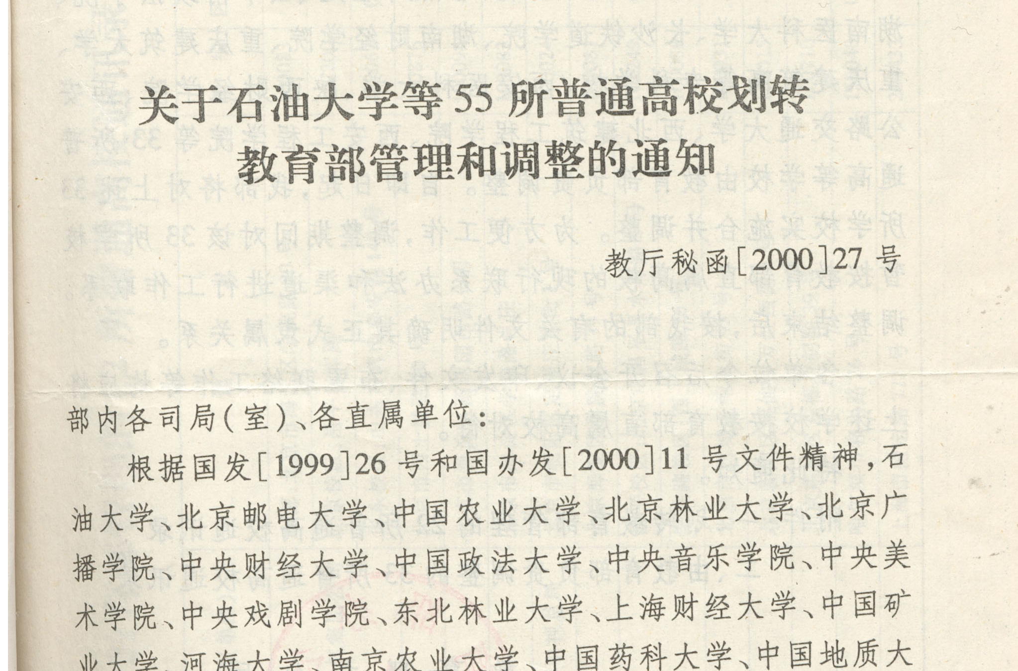 2000年2月18日,学校收到《国务院办公厅转发教育部等部门关于调整国务院部门(单位)所属学校管理体制和布局结构实施意见的通知》,我校正式由国家...