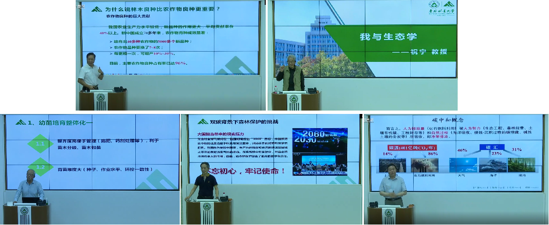 讲座中,林木遗传育种国家重点实验室名誉主任杨传平教授、57年毕业留校为帽儿山实验林场建设作出突出贡献的祝宁教授、曾任黑龙江省林业研究所所长的张羽教授、曾任林学院党委书记的胡春祥教授、中国林学会森林经理专业委员会理事范文义教授,用自己的故事描绘了一代代林学人不畏苦难、兢兢业业的奋斗历程,他们讲述了“林木良种与强化育种”“我与生态学”“主要树种育苗”“我与东林森保的故事”和“森林在‘双碳’中的作用”等精彩课程,回顾了林学院背倚林海、扎根黑土的七秩历程,讲述了林学人奋发自强、艰苦奋斗的峥嵘岁月。